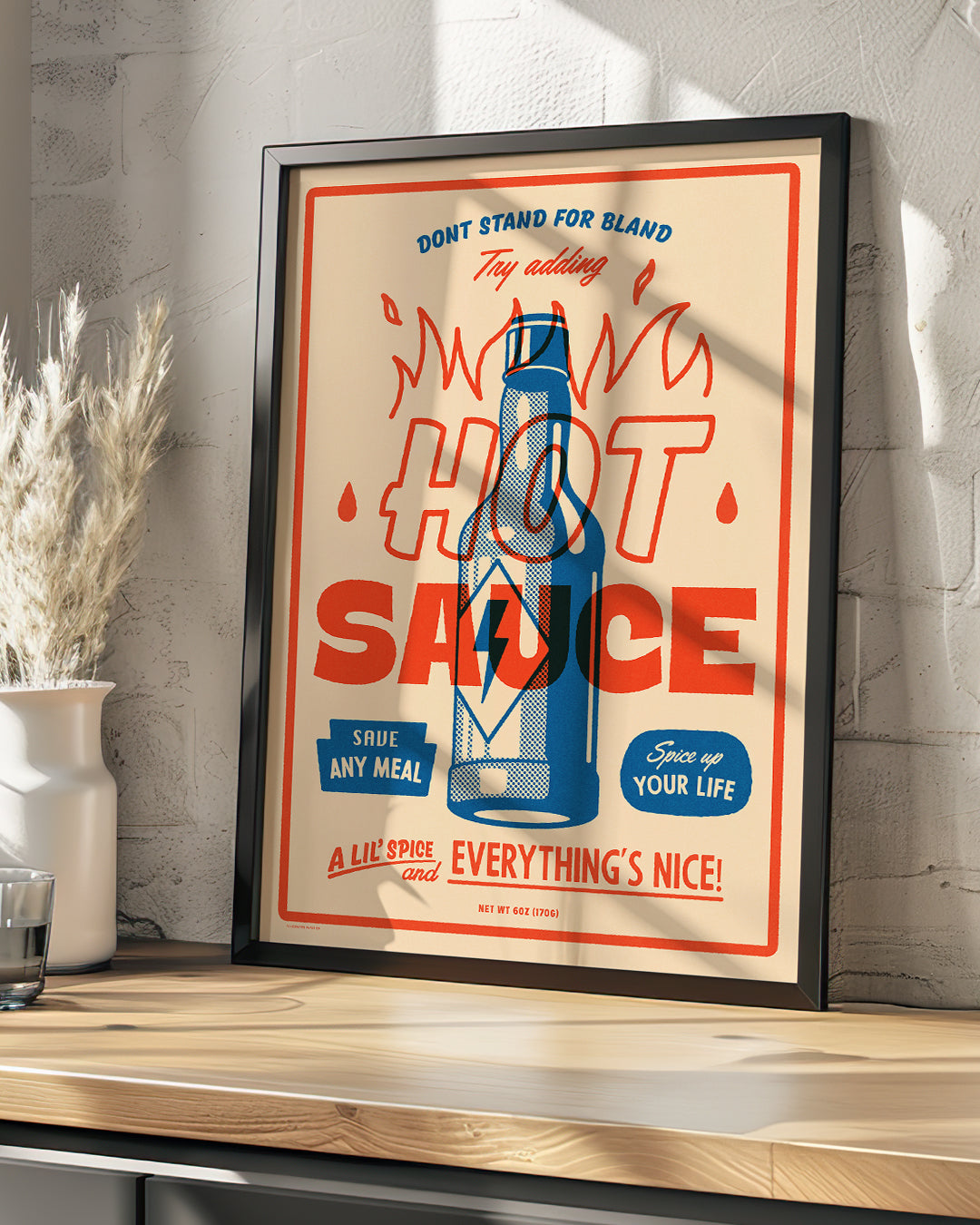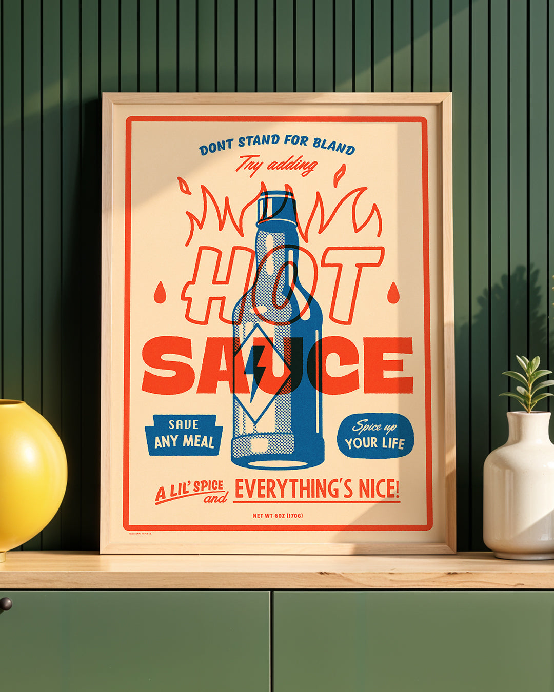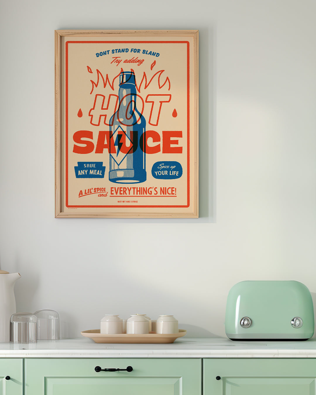This week's print is a tribute to the undisputed queen of condiments, the almighty hot sauce. We are forever inspired by vintage adverts and amazing hand-painted sale signs that were used in grocery stores and supermarkets. This inspiration greatly informed the colour choices of this week's print - keeping it to the classic red and blue of the vintage sale signs, as well as the typographic decisions.