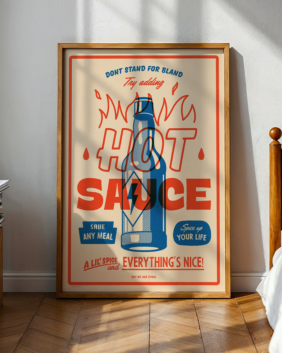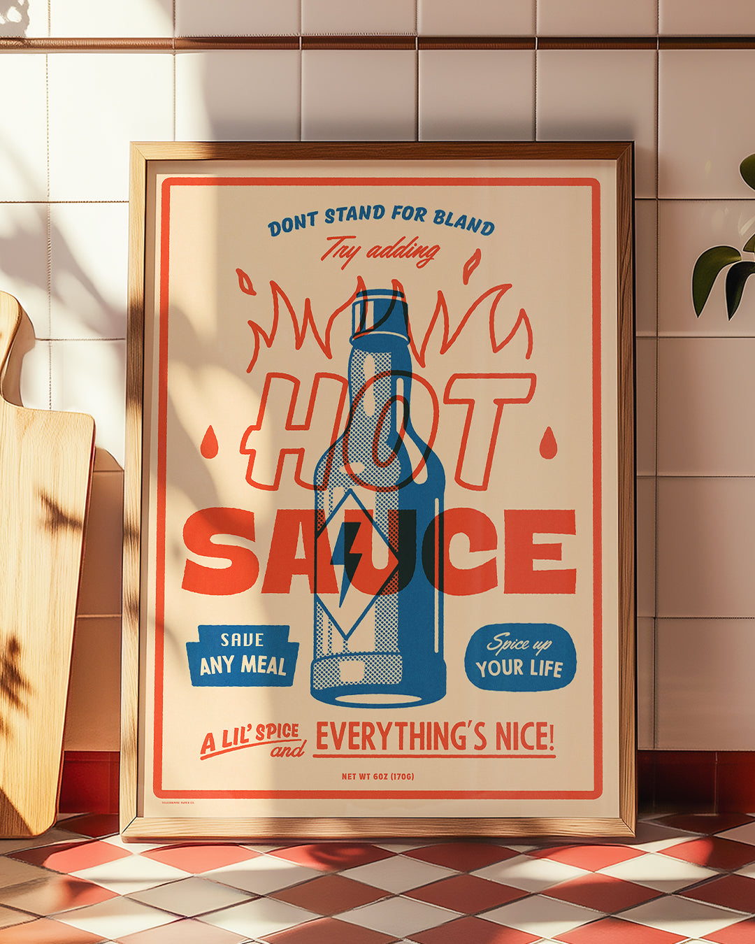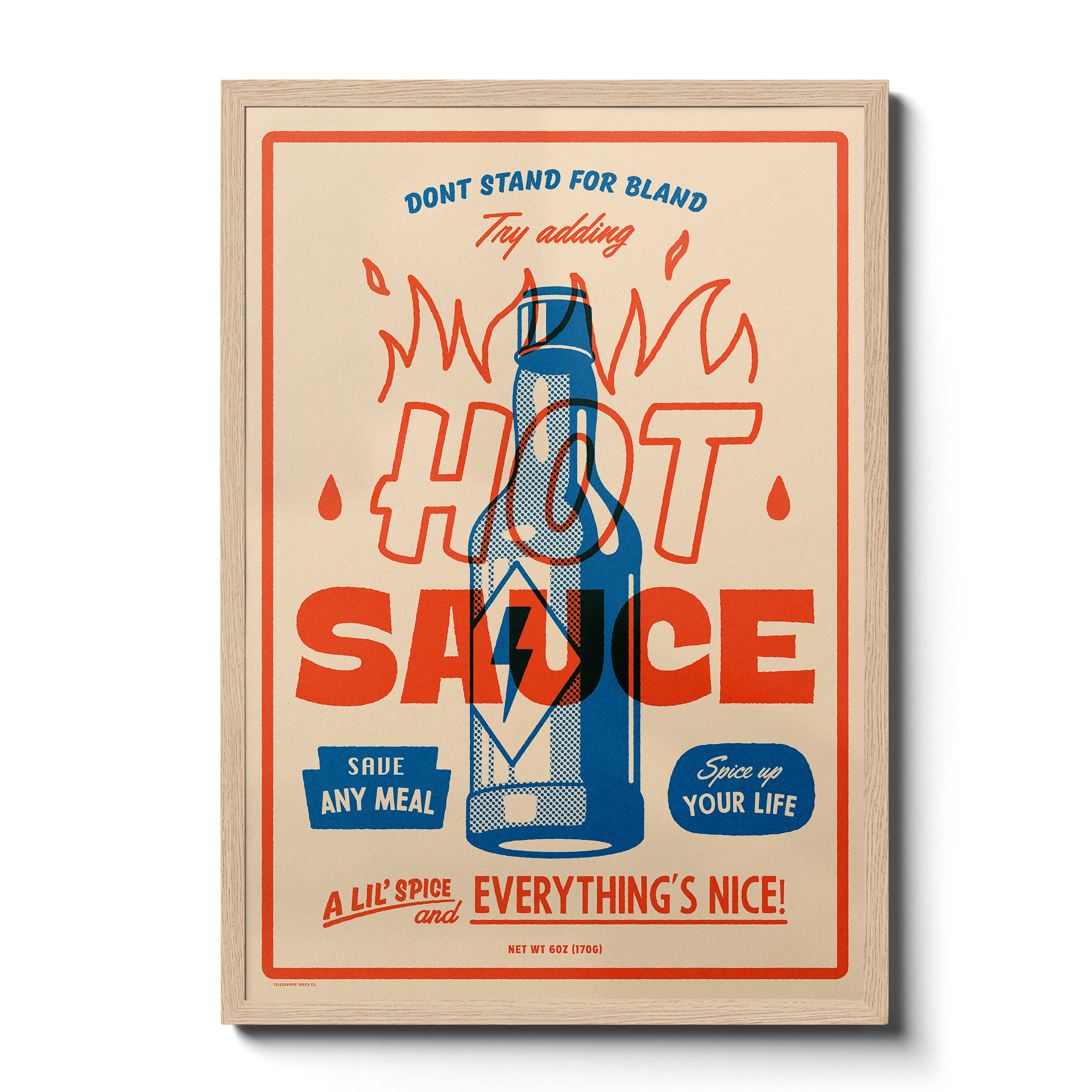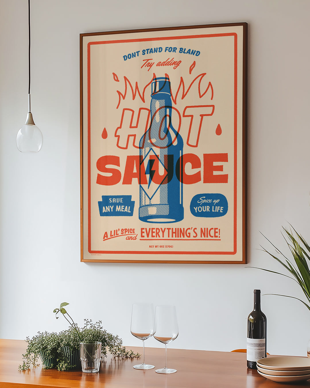 This week's print is a tribute to the undisputed queen of condiments, the almighty hot sauce. We are forever inspired by vintage adverts and amazing hand-painted sale signs that were used in grocery stores and supermarkets. This inspiration greatly informed the colour choices of this week's print - keeping it to the classic red and blue of the vintage sale signs, as well as the typographic decisions.