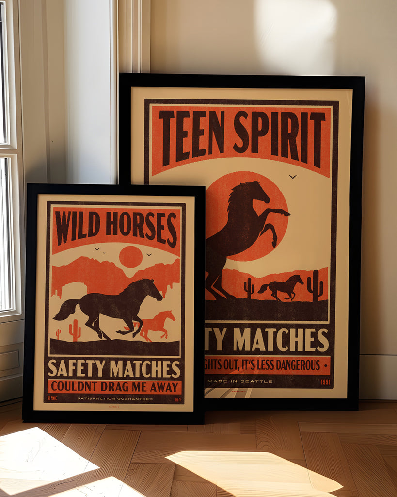 We began the designs with an element that we found consistent throughout vintage matchboxes - western design and in particular, horses. We love to add nods to our favourite things in our work also, so this week's prints are also inspired by two incredible and iconic songs. We wanted to use the lyrics of each song within the design and they are, not so subtly, used as the brand names, both of which we think are reminiscent of the time we're referencing.