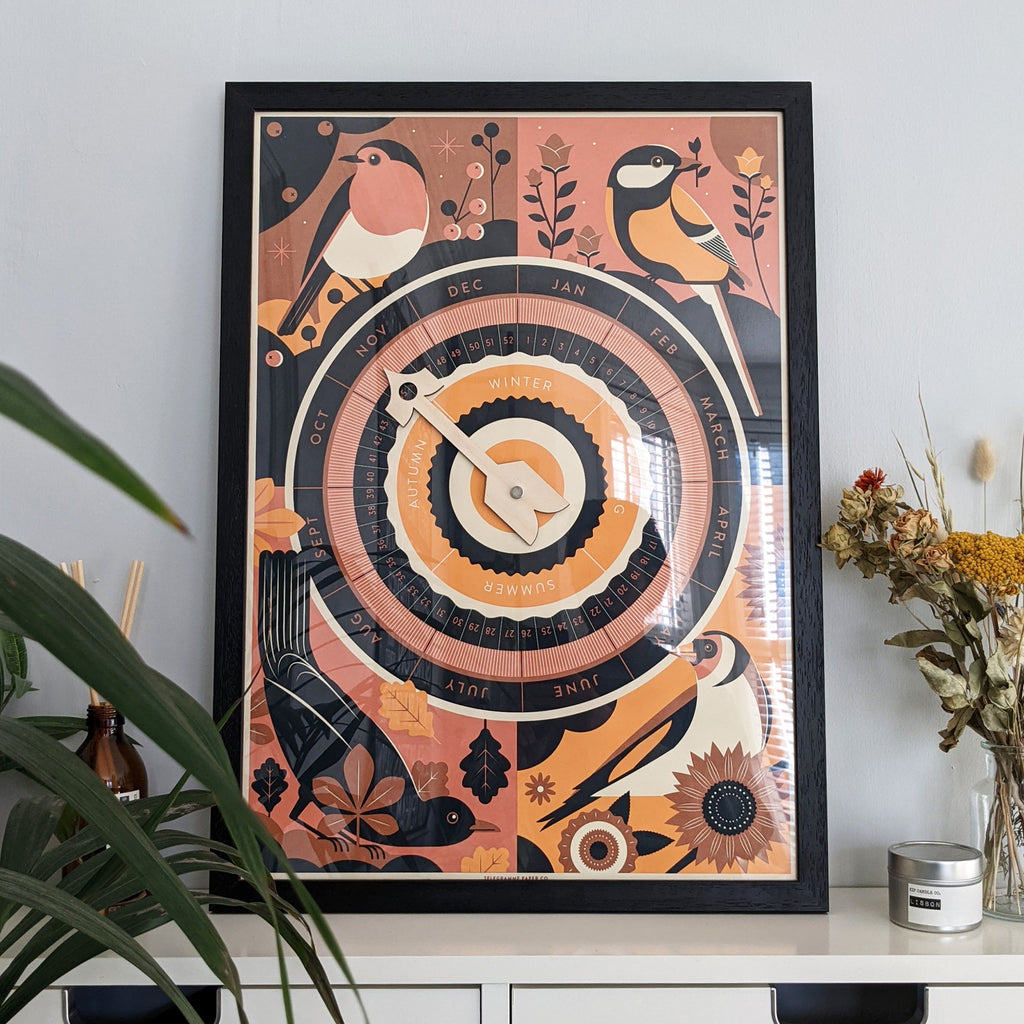 The hand pulled, 4 colour screenprint lets you count through the weeks and months of the year using a rotating laser cut wooden arrow, held by a 10mm magnet (which is strong enough to hold through the glass of a frame too).