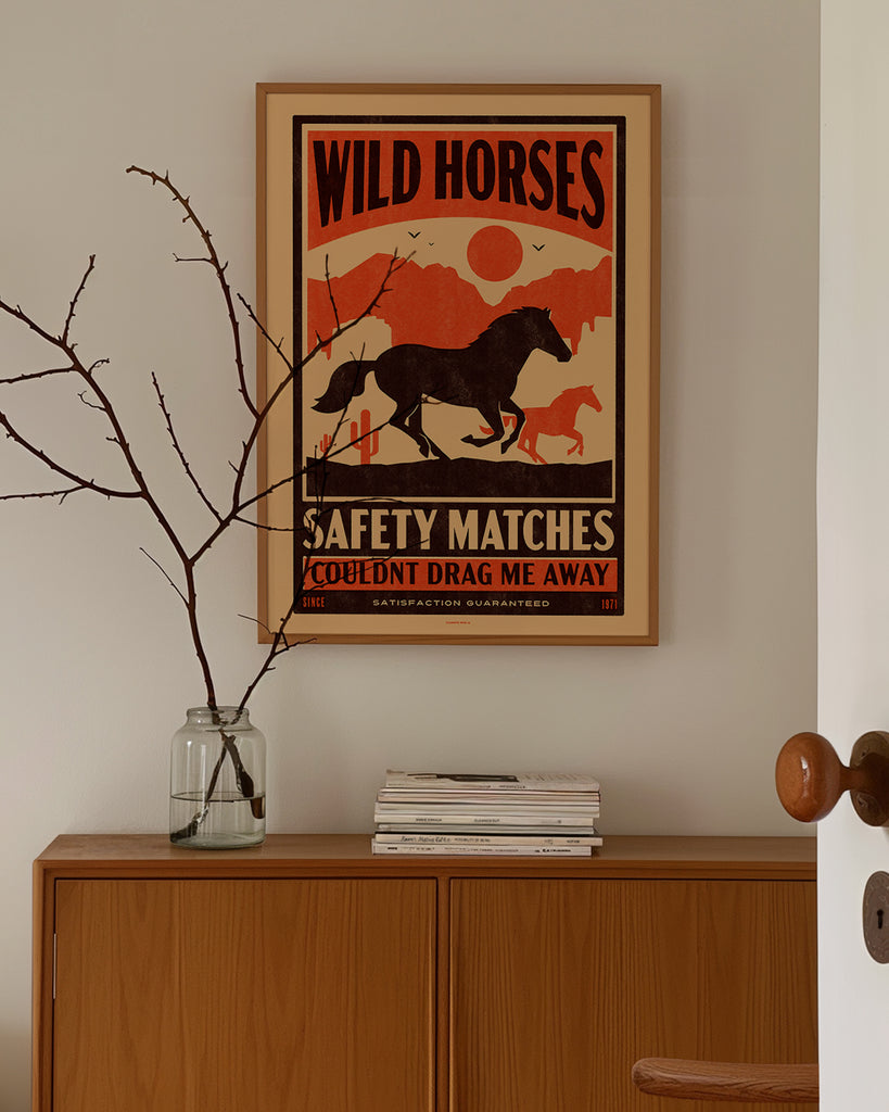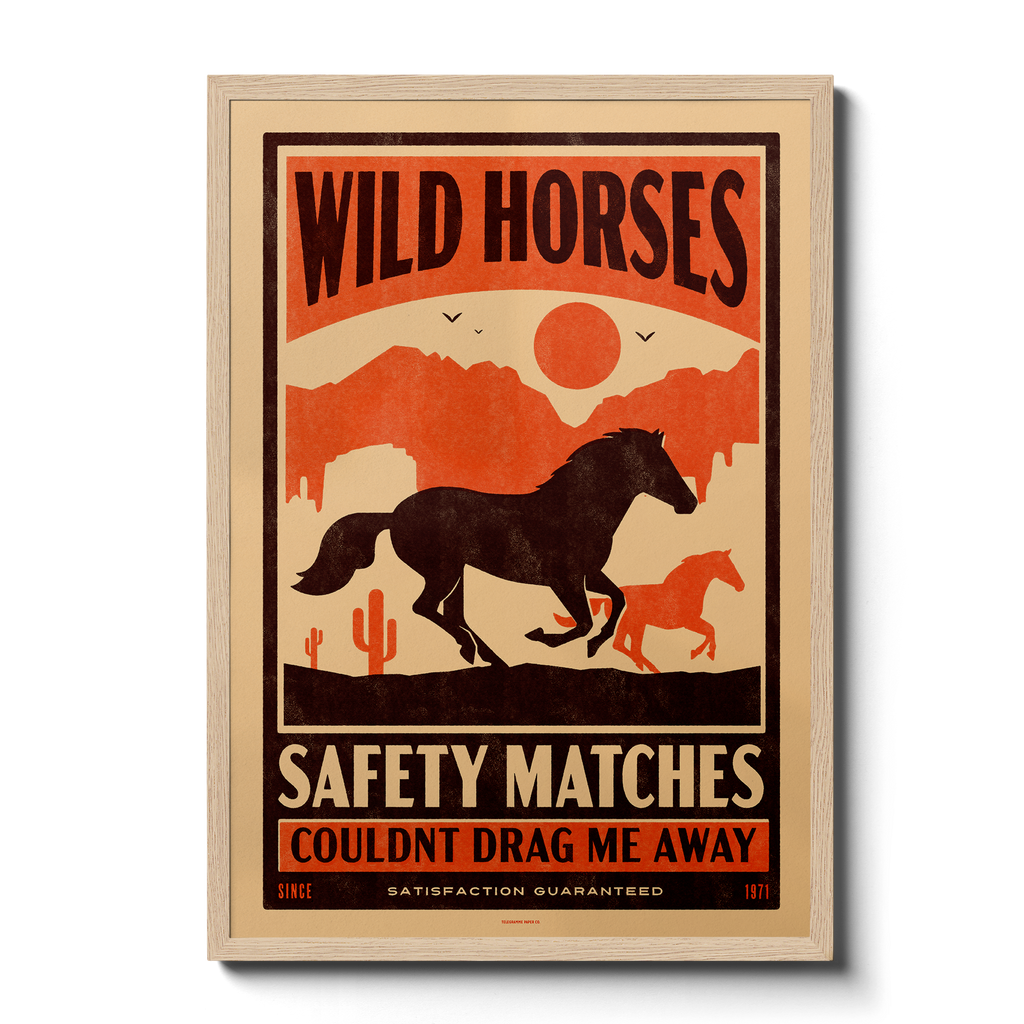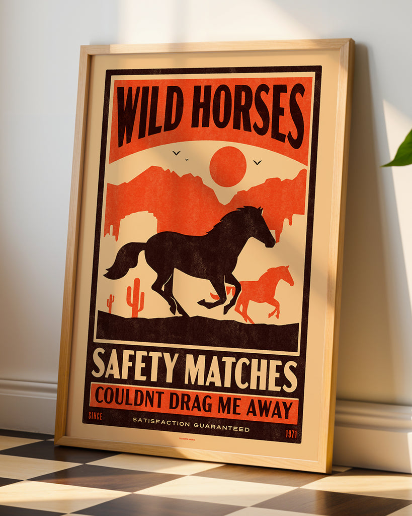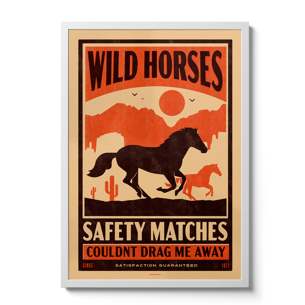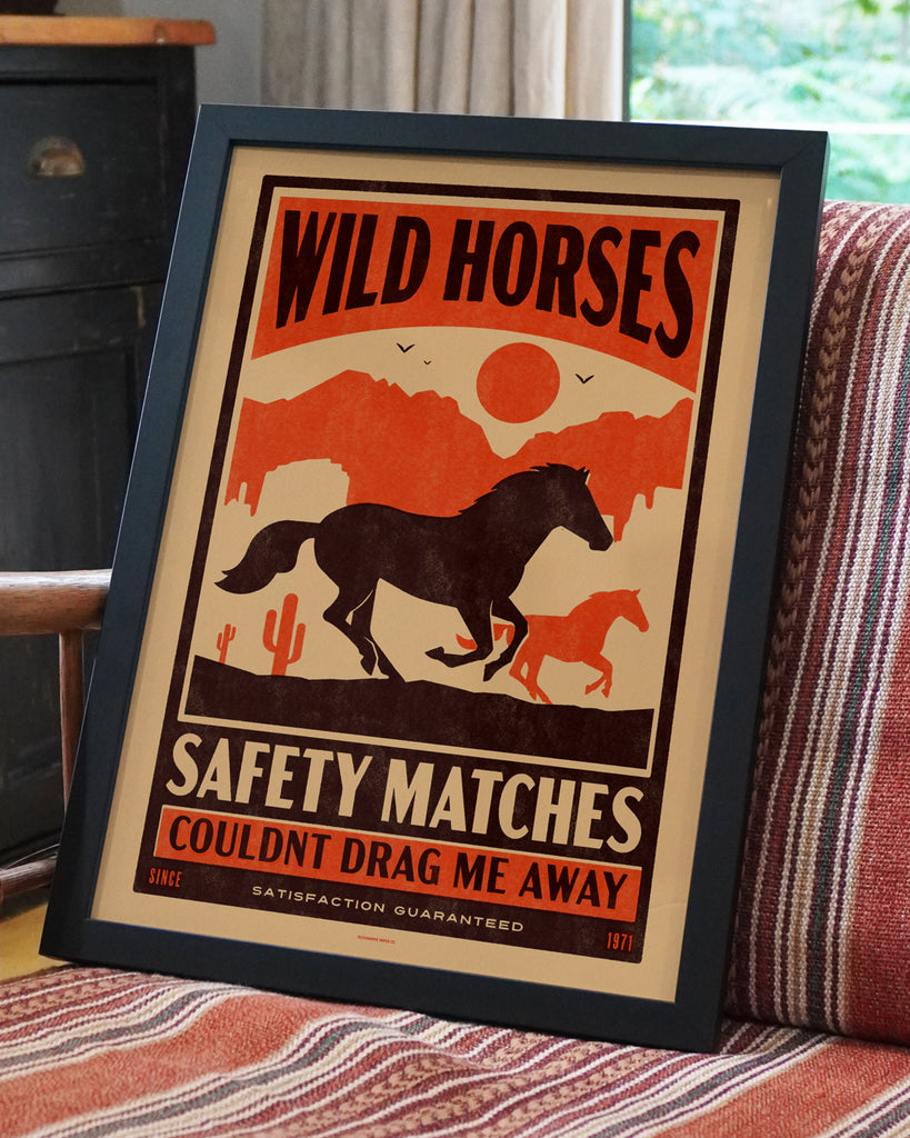 We began the designs with an element that we found consistent throughout vintage matchboxes - western design and in particular, horses. We love to add nods to our favourite things in our work also, so this week's prints are also inspired by two incredible and iconic songs. We wanted to use the lyrics of each song within the design and they are, not so subtly, used as the brand names, both of which we think are reminiscent of the time we're referencing.